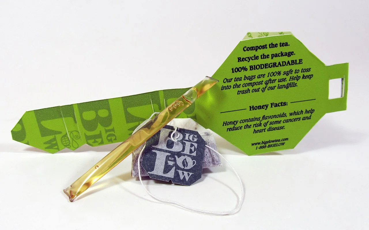 This is a repackaging project for Bigelow Green Tea. This design is more sustainable than the current package-within-a-package design, it is more easily transported to enjoy during the work week away from home, and also comes with individual honey straws that double as stirrers. Instead of using individual foil-lined packages inside another package that are not recyclable, this design takes advantage of a thicker, 100% recyclable paper that is sealed to keep the tea fresh. The Tea Ring is not only fun and clever, it's also eco-friendly.